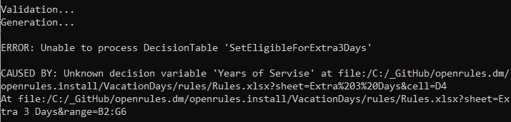 If OpenRules finds errors during the validation of your decision model, it will report error messages in a user-friendly format. Here is an example of the error message: