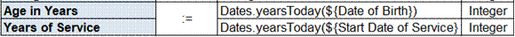 These variables will be automatically calculated as the number of years from today until “Date of Birth” and “Start Date of Service” correspondingly.