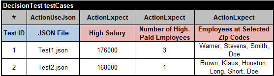 This table defines 2 test cases by referring to the proper JSON files “Test1.json” and “Test2.json”. It is important that you still may provide the expected results in the columns “ActionExpect”.