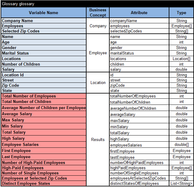 As you may guess, the expression Sum of Number of Children of Employees calculates the total number of children for all employees assuming that business concept Employee contains the decision variable “Number of Children”. Here is the proper Glossary from the new standard sample “Analyze Employees“: