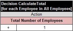 OpenRules customers use the qualifier “of” to write complex expressions as combinations of two or more individual decision variables. For example, the business concept “Employee” may include decision variables “Name”, “Salary”, “Gender”, etc. Another business concept “Department” may have a decision variable “Manager” of the type “Employee”. In your decision tables you may use expressions such as “Salary of Employee” or “Manager of Department“. However, if Department includes a collection of objects such as the decision variable “All Employees” of the type Employee[] and you want to calculate the total number of all employees, you need to write a loop such as below: