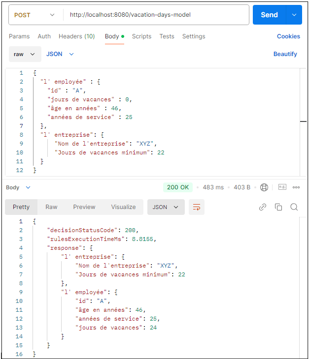 The above POSTMAN’s response does not show temporary attributes extra5Days, extra3Days, and extra2Days. Why? This was achieved by marking them as “tmp” in the Glossary column “Used As”. You may use this new indicator “tmp” to exclude any variable from the decision model’s JSON response.