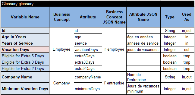 It includes two business concepts “Employee” and “Company” and their JSON names are specified in French as “l’ employée” and “l’ entreprise” in the column “Business Concept JSON Name”. Some attributes also have French names defined in the column “Attribute JSON Name”.