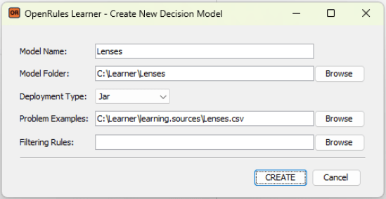 September 18, 2025. OpenRules Release 11.1.0 introduces an essentially enhanced version of OpenRules Machine Learning component known as “Rule Learner“. Now it can generate working decision models based only on a set of problem examples. Subject matter expert can use a simple graphical interface that looks as below: