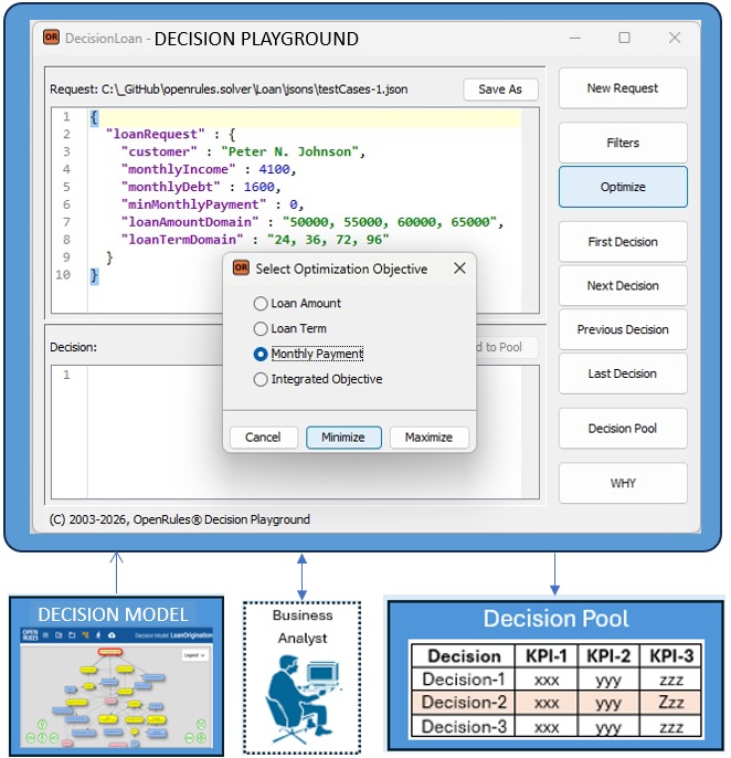 Jan 15, 2026. OpenRules Release 11.2.0 introduces Decision Playground, a powerful interactive component of the OpenRules Decision Intelligence Platform. Decision Playground enables business users to visually experiment with decision scenarios, compare multiple alternatives, and find optimal solutions—all without requiring changes to underlying decision models. Read the announcement, download, and try it for free from http://RuleSolver.com. Here is the architectural scheme of Decision Playground: