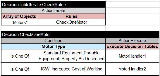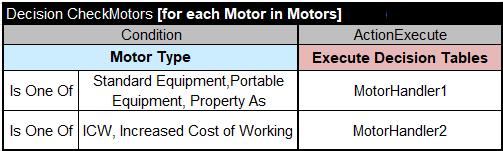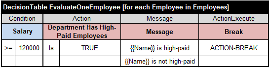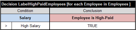 Decision tables “DecisionTableIterate” has been replaced with a regular decision table of the type “Decision” or “DecisionTable” and the phrase “[for each <collection-element> in <collection>]“. Here is a simple decision table that iterates over an array of Employees and marks some of them as High-Paid: