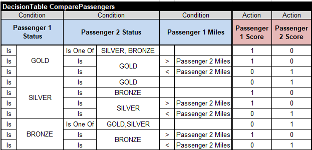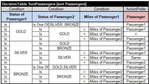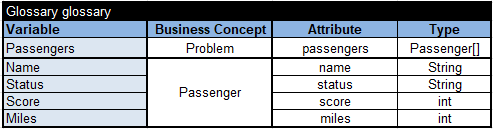 For each pair of passengers “Passenger1” and “Passenger2” this table selects a preferred passenger in the last column of the type “ActionPrefer”. When the statuses of both passengers are the same, the number of frequent miles serves as a tiebreaker. When even the miles are the same, you may use “=” or “Same” (or any other word different from Passenger1 and Passenger2). There is no need to define “Passenger1” and “Passenger2” in the glossary that simply looks as below: