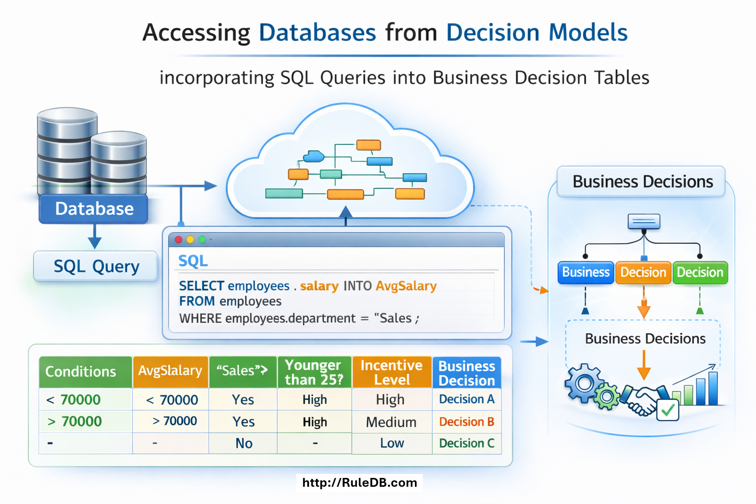 Traditionally, business rule engines do not communicate with relational databases directly. Instead, they expect to receive input and produce output via intermediate objects defined in Java, JSON, or XML, assuming that database access is handled through separately defined SQL statements. However, some customers want to apply user-friendly business rules to query databases directly — while preserving the full power of SQL for handling databases of any complexity. Here is how Rule DB delivers this capability: