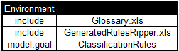 The last table “Environment” includes “GeneratedRulesRipper.xls” as the default generated rules. A subject mater expert may easily change them in this table to “GeneratedRulesC45.xls” or “GeneratedRulesTest.xls”.