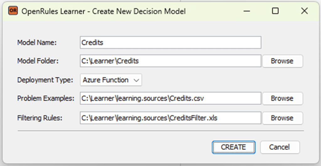 Here we assume that your installed Rule Learner in the folder C:/Learner. The name of the decision model will be “Credits” and the model will be generated in the folder “C:\Learner\Credits”. Here we selected use the deployment type “Azure Function”.
