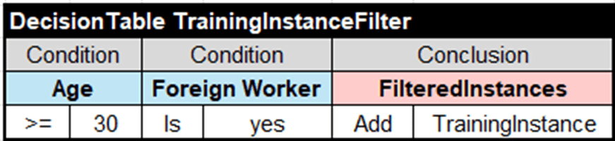 However, not all samples (training instances) play the same role when we evaluate a personal credit. That’s why we may generate different decision models for different categories of people. For example, let’s chose only those examples that characterize foreign workers who are 30 years old or older. We can do it by using the following filtering rules provided in the file “CreditsFilter.xls” of the folder “learning.source”: