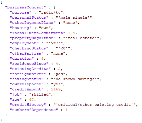 Rule Learner also generates two files “rules/Test.xls” and “rules/TestJson.xls” for testing purposes. It also generates JSON files with different test data located in the folder “json“. Here is an example of the fist test case: