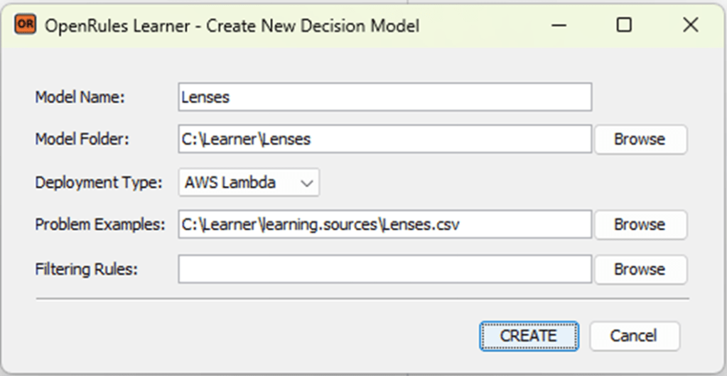 It allows you to enter your Model Name and location, select a Deployment Type, and choose a CSV file with your problem examples. after you click on the button “CREATE”, Rule Learner will generate the proper decision model (in this case “Lenses” inside the folder “C:\Learner\Lenses”). Here is the typical generated content: