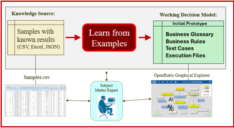 The latest release of Rule Learner allows subject matter experts to quickly convert business problem examples into an executable decision model and continue to enhance it using the core OpenRules decision modeling tools. A top-level diagram above show how Rule Learner can “Learn from Examples“. At the start of a decisioning project, subject matter experts provide samples of their business problem with various input parameters and expected output. Problem samples can be provided in CSV, Excel, or JSON format. Using only these samples, Rule Learner will quickly generate a working Decision Model in OpenRules format including: