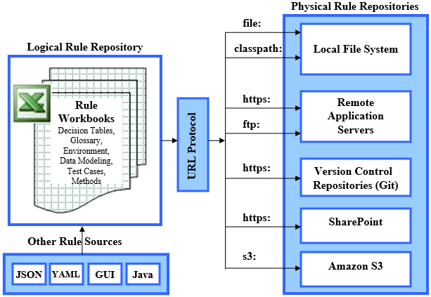 OpenRules uses an URL pseudo-protocol notation with prefixes such as “file:“, “classpath:“, “https://“, “ftp://“, “s3://“, etc.