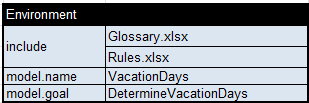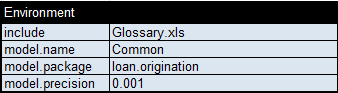 Here the folder “Common” contains the file “Glossary.xls” with a common glossary for all included decision models. Its file “DecisionModel.xls” contains the Environment table that refers to this “Glossary.xls” and defines other common properties: