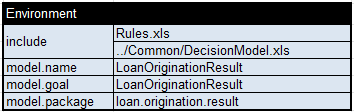 - DecisionModel.xls: with the Environment table that includes a reference to the Common “DecisionModel.xls” and its own Excel files with the proper rules