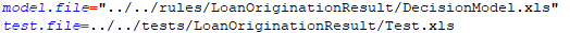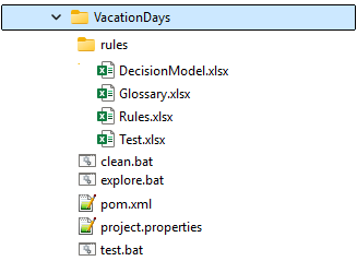 - project.properties: a test file that defines the main entry point as the property “model.file=”rules/DecisionModel.xlsx” and test cases as “test.file=”rules/Test.xlsx”.