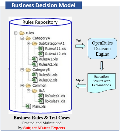 OpenRules utilizes the well-established spreadsheet concepts of workbooks, worksheets, and tables to build enterprise-level rule repositories. Such repositories are comprised of multiple Excel workbooks with worksheets and decision tables placed in different folders to maintain business logic distributed by logical categories.