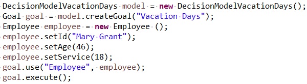Here is an example of how the decision model “Vacation Days” can be invoked using Launcher.java:
